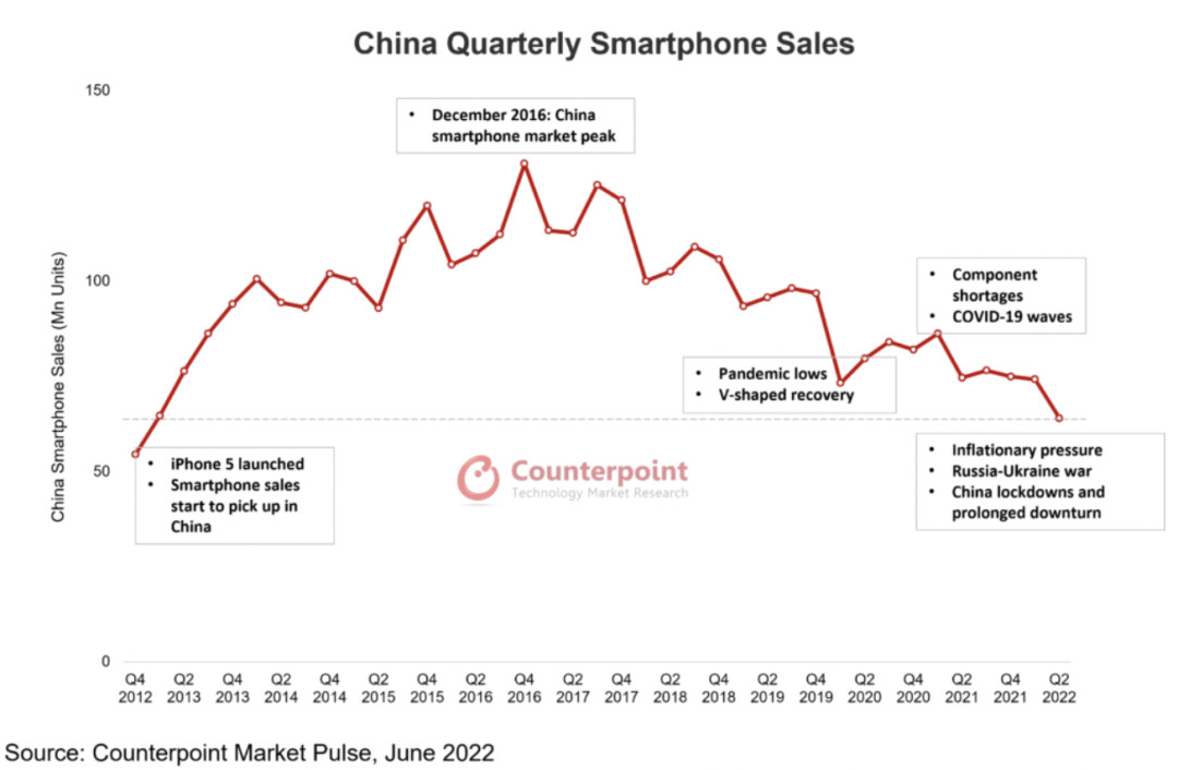 Counterpoint:2022 年第二季度中国智能手机销量创下新低