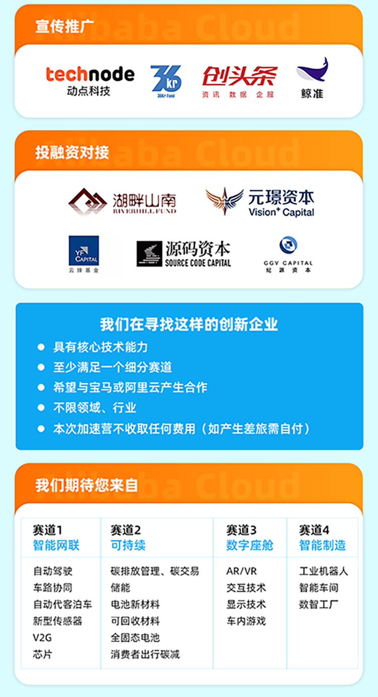 阿里云与宝马草创车库正寻觅“智能网联”、“自动驾驶”、“可继续”、“数字座舱“及”智能制作“相关的优异立异企业。当选本次联合加快营即有机会与阿里云及宝马草创车库进行1对1事务对接,讨论“计划共创”、“概念验证”、“一起研制”等协作形式。一起也将收成投融资对接、方针解读、财税法训练等加快服务,而且全程免费哦!(如发生差旅需自理)