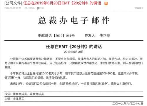 6月28日,华为心声社区发布任正非在2019年6月20日EMT《20分钟》的说话内容。任正非着重,华为公司未来要拖着这个国际往前走,自己发明规范,只需能做成国际最先进,那咱们便是规范,他人都会向咱们挨近。别的,任正非也表明,本年咱们将从全国际招进20-30名天才少年,下一年咱们还想从国际范围招进200-300名。这些天才少年就像“泥鳅”相同,钻活咱们的安排,激活咱们的部队。