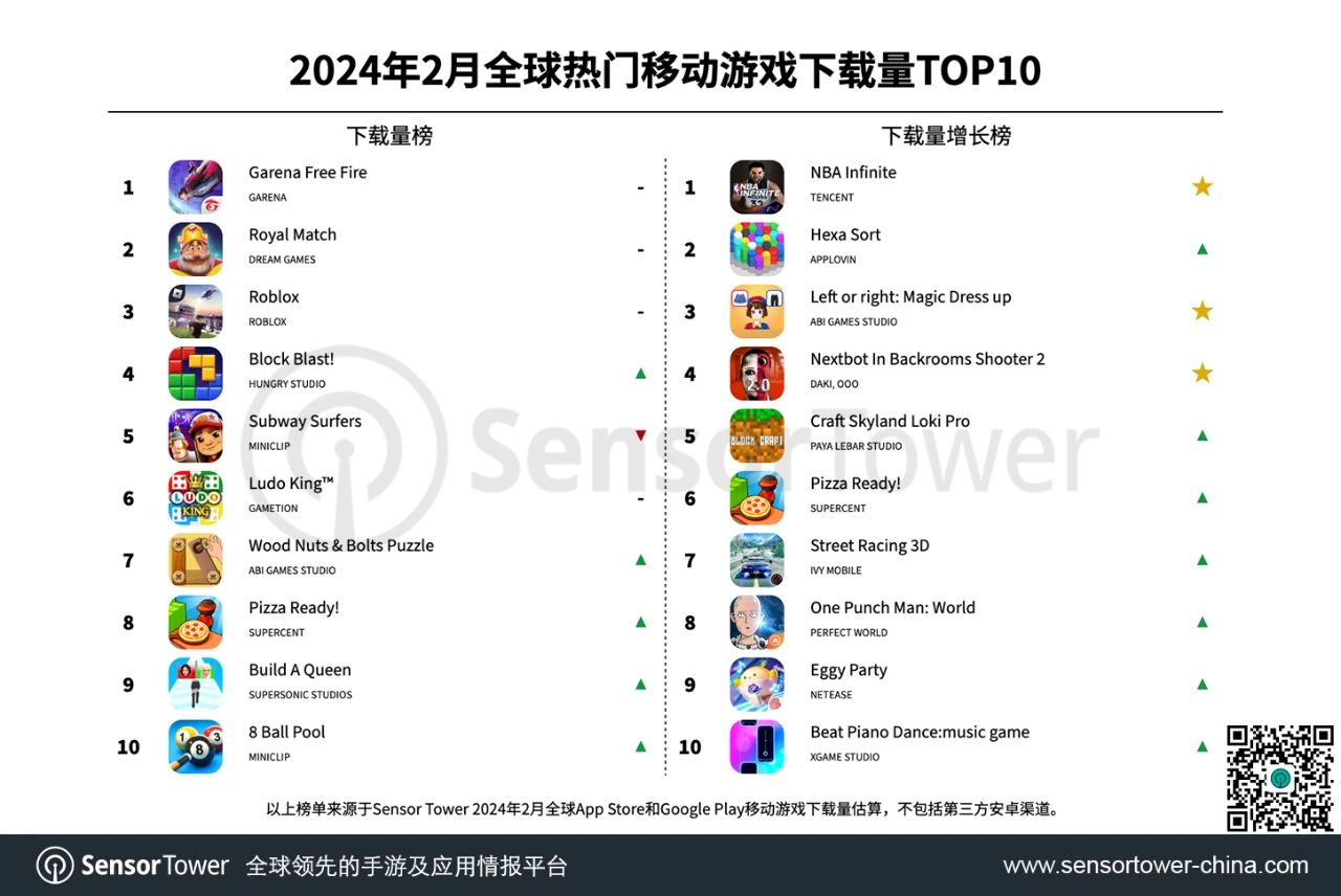 排名前五的别的3款游戏依次为《Roblox》、Hungry Studio《Block Blast!》和Miniclip《Subway Surfers 地铁跑酷》。
